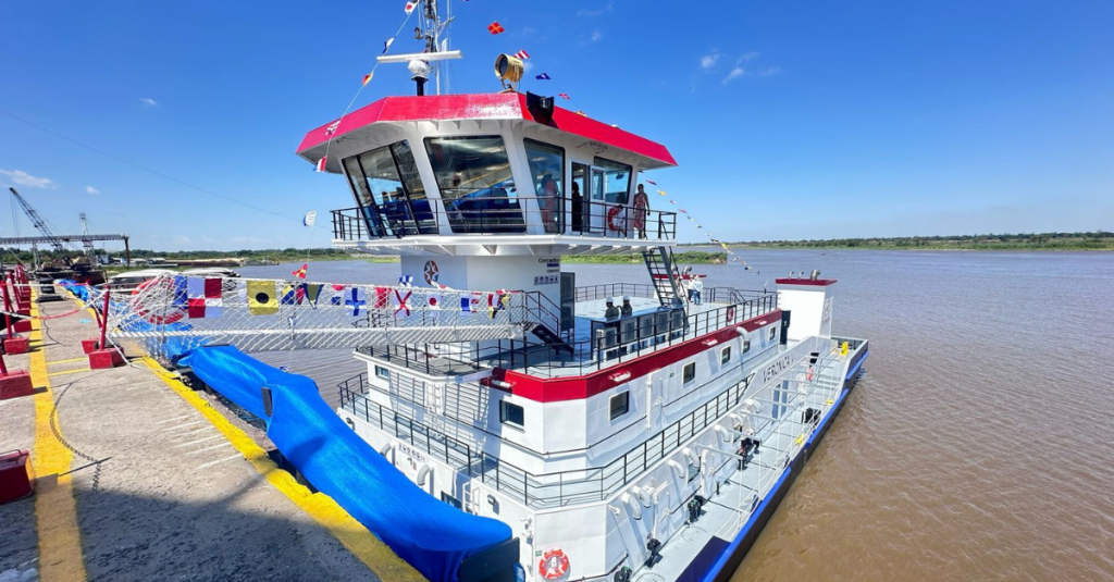 De CDS4115 River Pusher is specifiek ontworpen voor de rivieren Paraguay en Paranà, waar lage waterstanden tijdens het droge seizoen voor aanzienlijke uitdagingen zorgen. Met een diepgang van slechts 6,5 voet en aangedreven door drie robuuste Yanmar motoren, kan deze sleepboot het hele jaar door opereren. Zelfs onder de meest veeleisende omstandigheden. Deze nieuwe toevoeging aan de vloot van Girona S.A. verbetert hun vermogen om efficiënt droge bulk te vervoeren langs de 2.695 km lange Paraguay-rivier.